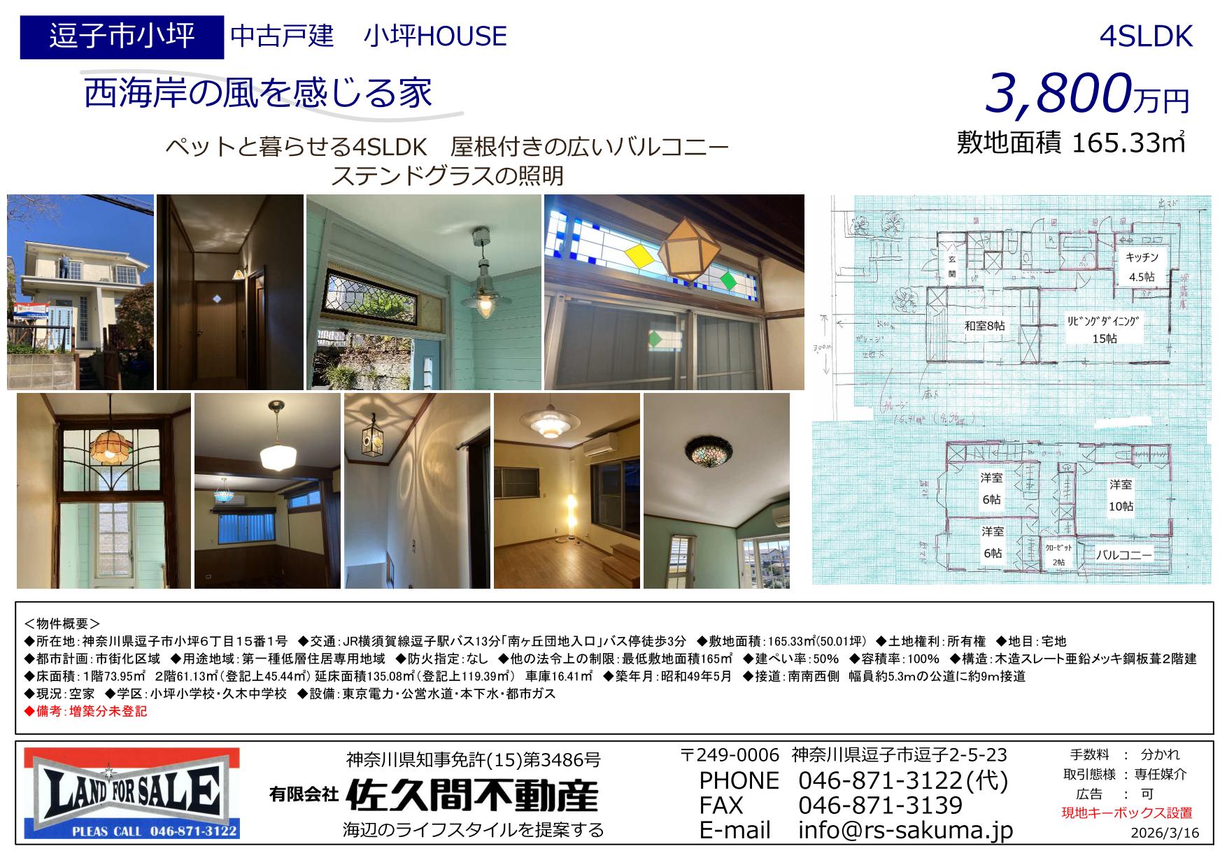 物件名:小坪HOUSE、所在地:神奈川県逗子市小坪6丁目15番1号 ◆交通:JR横須賀線逗子駅バス13分「南ヶ丘団地入口」バス停徒3分 ◆敷地面積:165.33㎡(50.01坪) ◆土地権利:所有権 ◆地目:宅地 ◆都市計画:市街化区域 ◆用途地域:第一種低層住居専用地域 ◆防火指定:なし ◆他の法令上の制限:最低敷地面積165㎡ ◆建ぺい率:50% ◆容積率:100% ◆構造:木造スレート亜鉛メッキ鋼板葺2階建 ◆床面積:1階73.95㎡ 2階61.13㎡(登記上45.44㎡) 延床面積135.08㎡(登記上119.39㎡) 車庫16.41㎡ ◆築年月:昭和49年5月 ◆接道:南南西側 幅員約5.3mの公道に約9m接道 ◆現況:空家 ◆学区:小坪小学校・久木中学校 ◆設備:東京電力・公営水道・本下水・都市ガス
